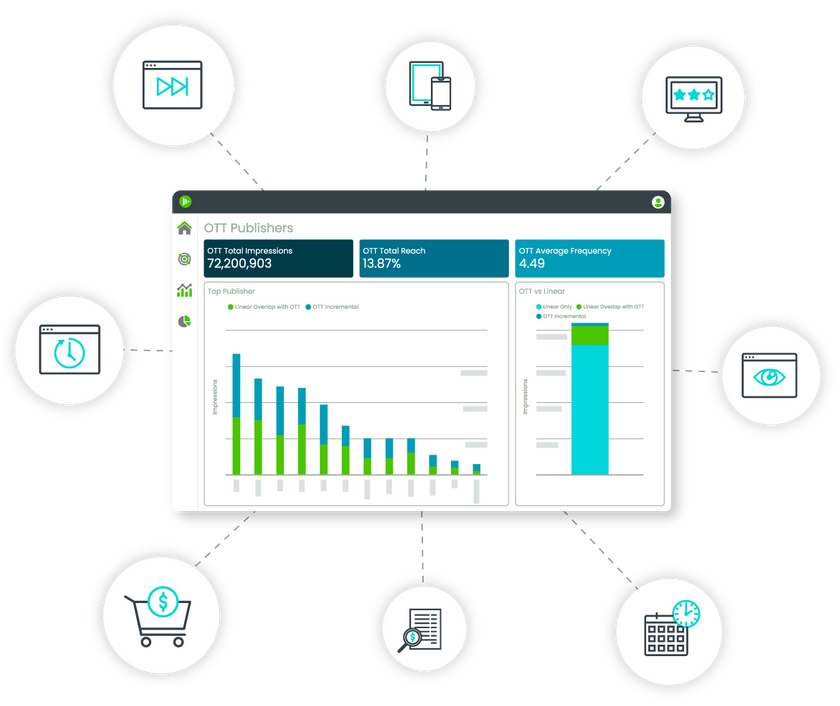 No more waiting on post-logs or cobbling together reports to show results. With iSpot, you can see how client ads are performing for target audiences across traditional TV and streaming publishers, in real time. Optimize your clients’ media investments with an always-on view of reach and incremental impressions across linear and 300+ CTV publishers and platforms — all within a single dashboard.