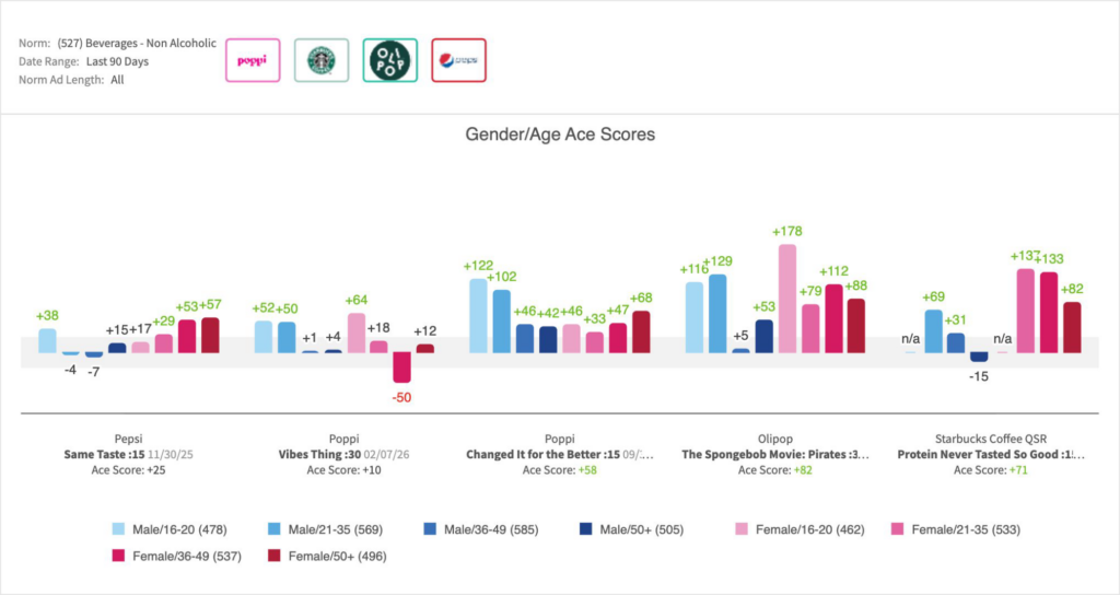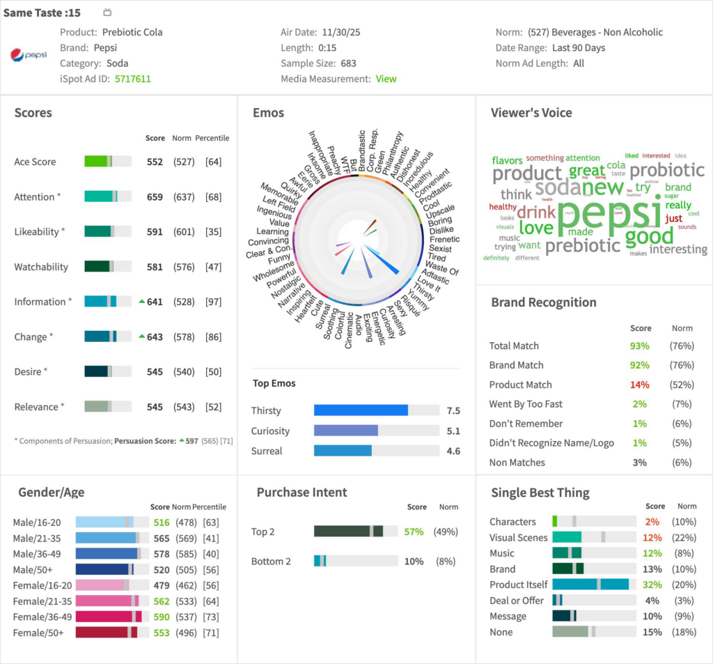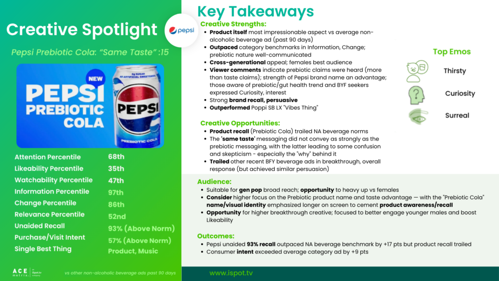 • Pepsi’s :15 “Same Taste” for the new Pepsi Prebiotic Cola earned overall response (Ace Score) in the 64th percentile (+25 pts vs norm) within the non-alcoholic beverage category (past 90-day benchmarks), placing it just above the category midpoint. This suggests a competent but not a competitively breakthrough execution: