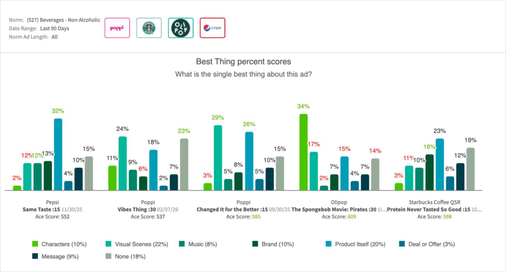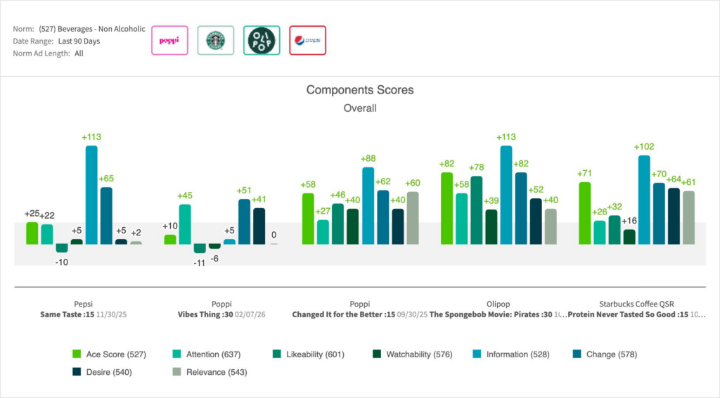 • Within the broader BFY beverage landscape over the past 180 days, “Same Taste” outpaced the Poppi Super Bowl LX “Vibes Thing,” but trailed the top-tier breakthrough of Poppi “Changed It for the Better” and a recent Olipop spot, as well as Starbucks’ protein offer: