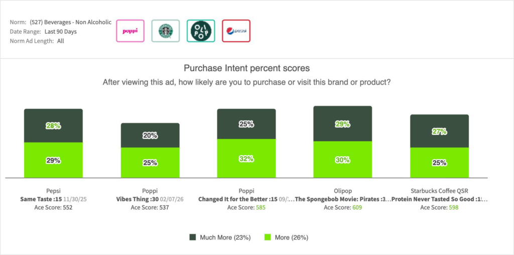 • However, “Same Taste” remained highly competitive in lower-funnel conversion. Pepsi’s 57% Top 2 Box intent tied that developed by the Poppi “Changed It for the Better” (57%) creative and closely followed Olipop (59%), both of which were more stylized, but still informative ads. Olipop took the tie-in route with the latest SpongeBob release.