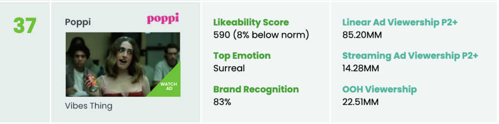 Pepsi’s Super Bowl LX “Vibes Thing” spot for Poppi ranked 37th among the 61 whistle-to-whistle ads airing during the Big Game: