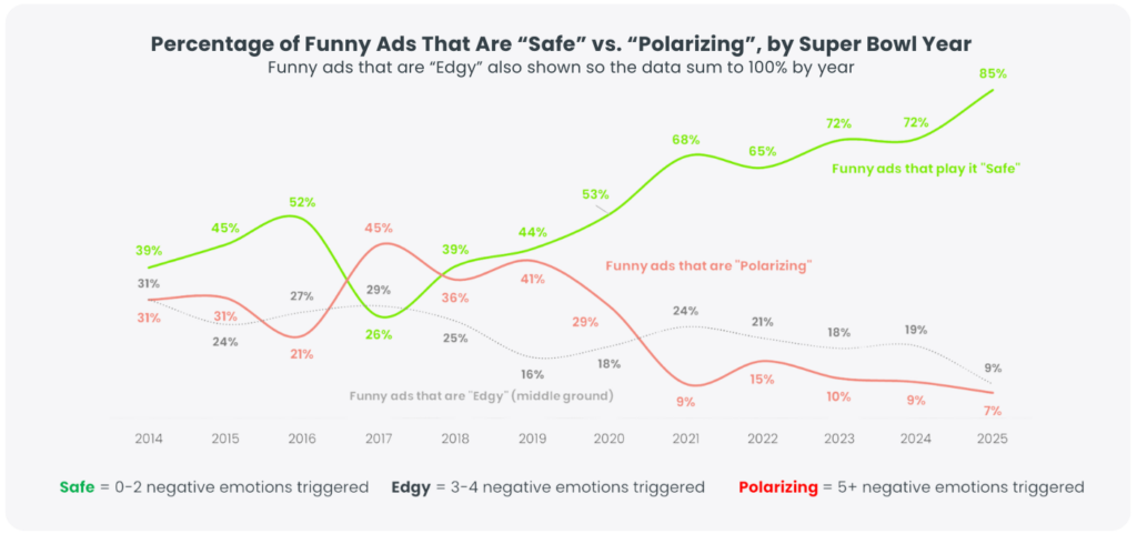 During last year’s Super Bowl, 71% of ads were funny—and more notably, an all-time-high 85% of ads used “safe” humor that was unlikely to rock the boat.