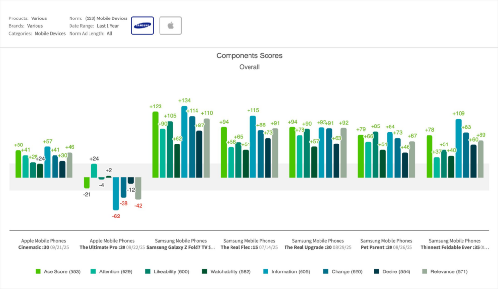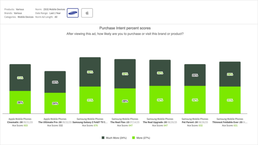 - Competition remains high as the top five mobile device ads over the past 90 days among American audiences were all Samsung ads for the Galaxy Z Fold 7, with four of the five sparking higher professed intent than the new iPhone 17 Pro spots: