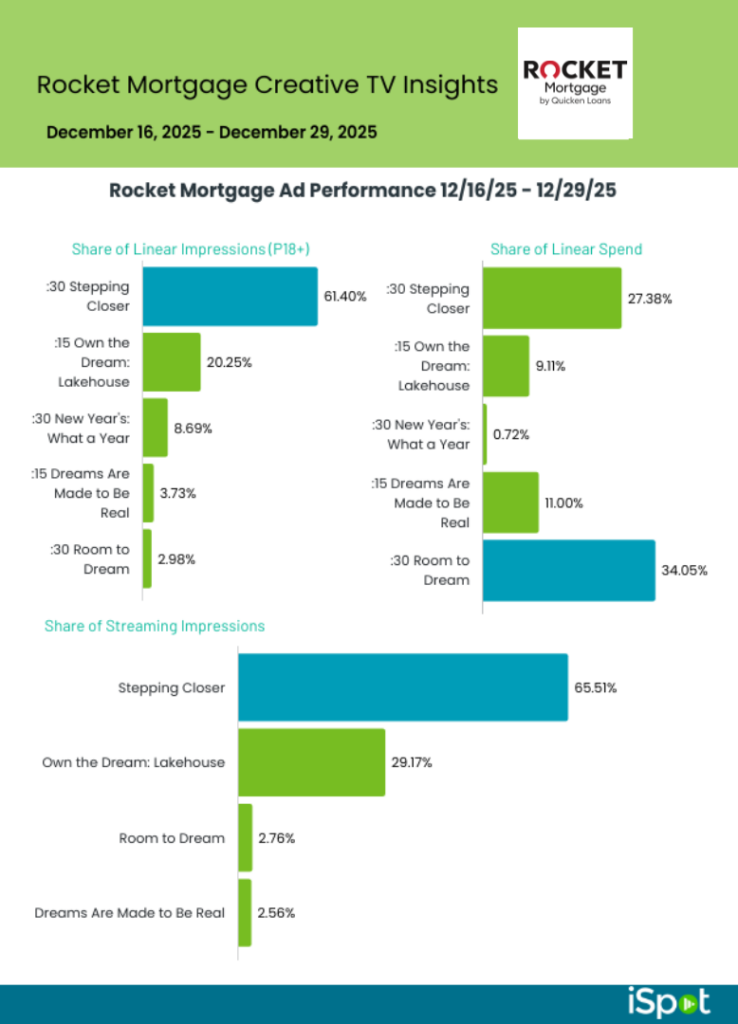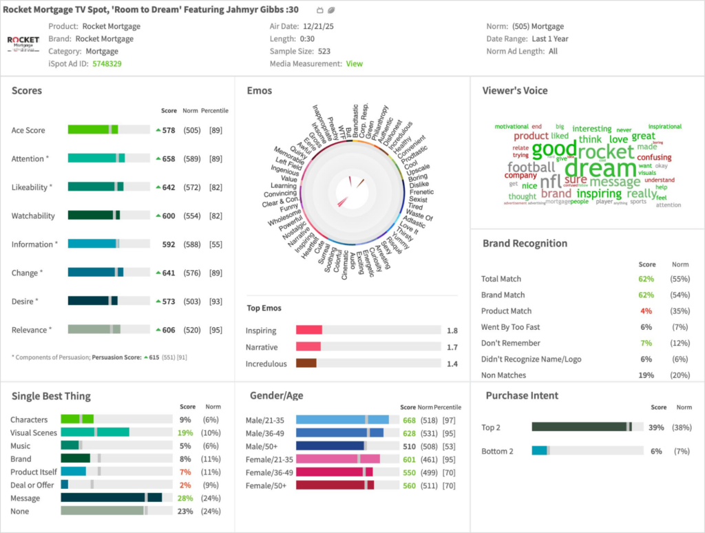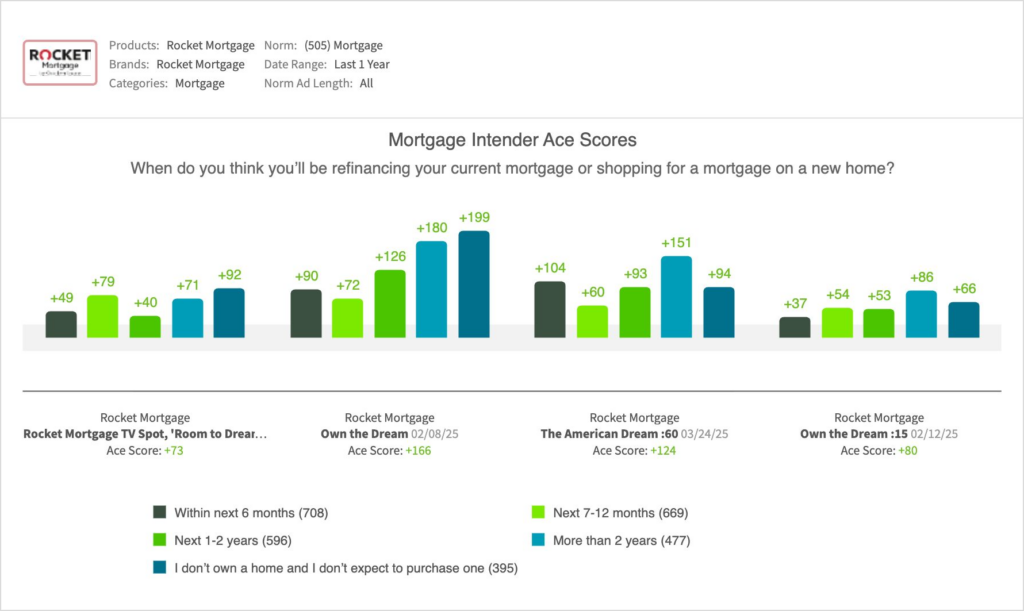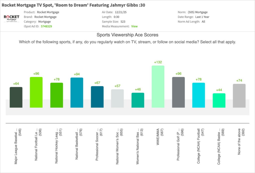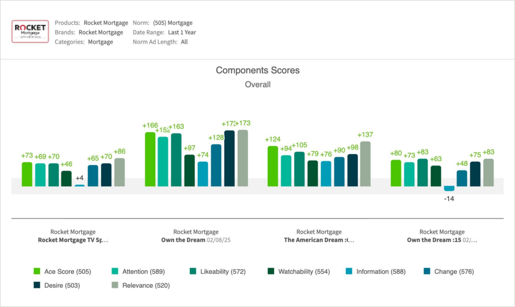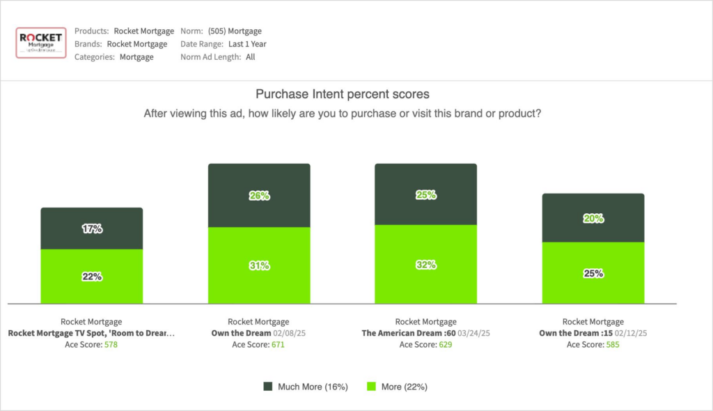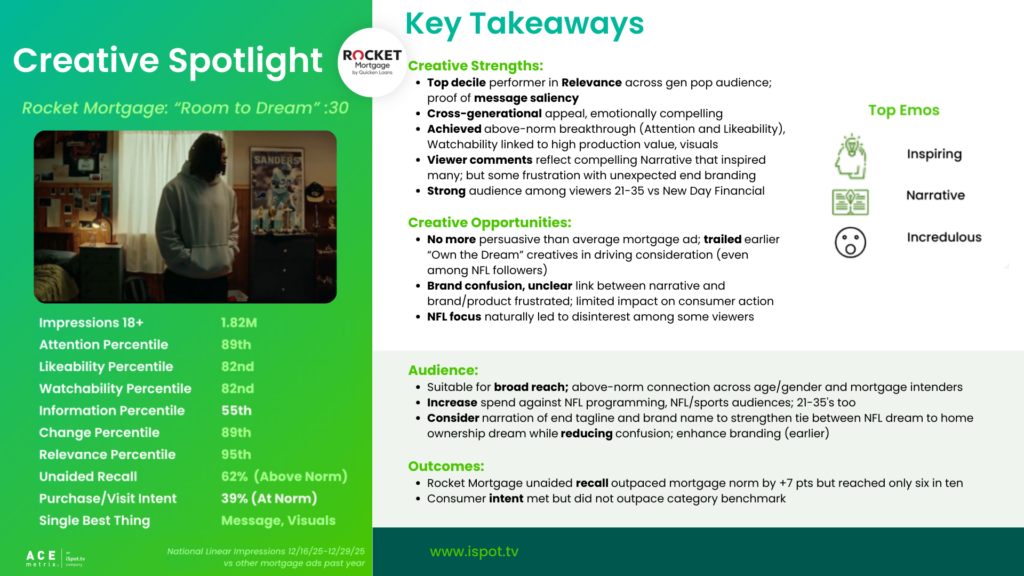 - When compared to other recent Rocket Mortgage spots, “Room to Dream” was a consistent performer, but trailed the high-impact spots launched earlier in the year:
