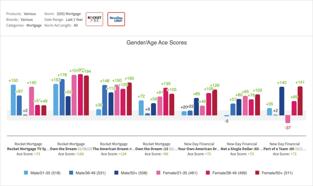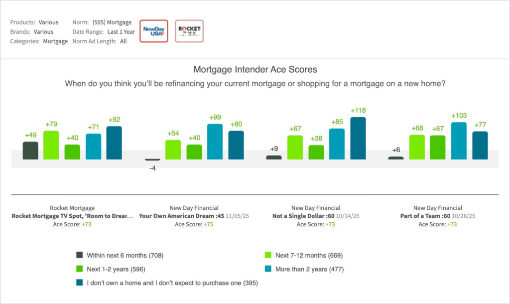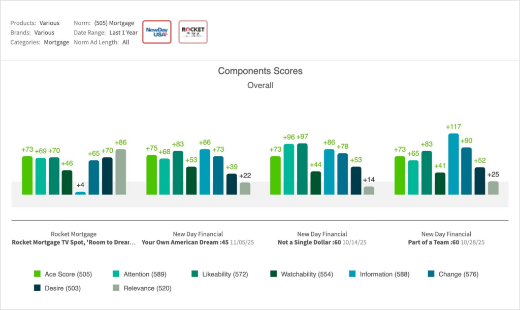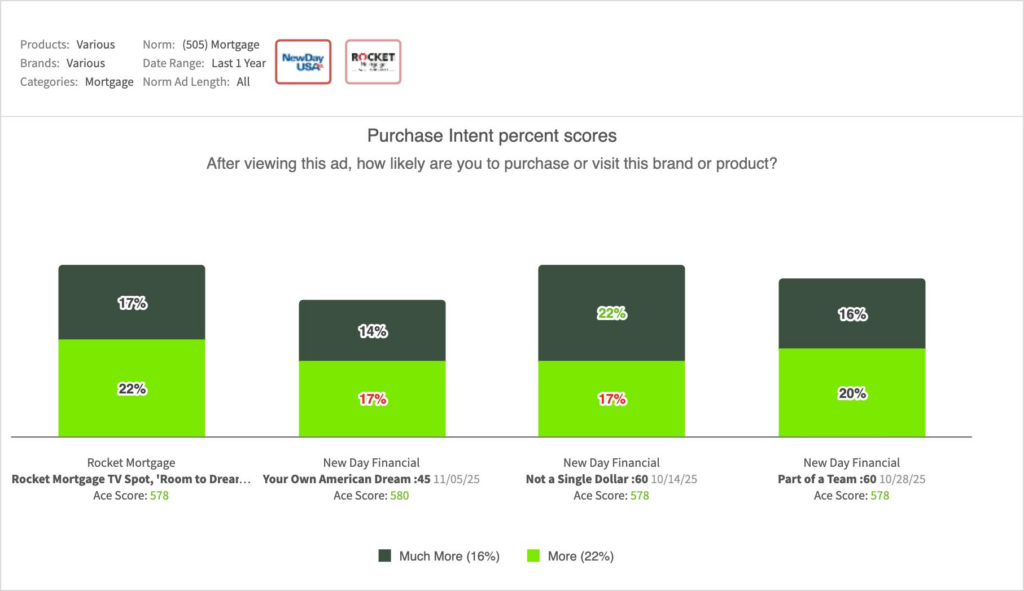 - Rocket Mortgage’s “Room to Dream” held a competitive edge in purchase/visit against New Day Financial’s most recent lineup, though it mirrored them in overall creative resonance: