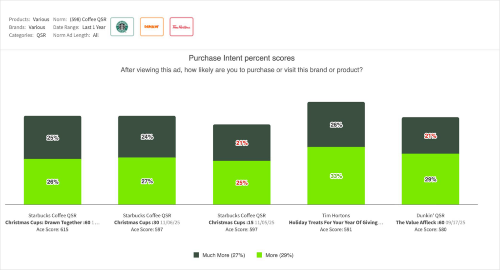 - The hero spot registered excellent breakthrough ability ranking in the 91st percentile in grabbing Attention and 95th in Likeability while also outpacing coffee QSR norms (past year) in Relevance/relatability. While none of the new spots were perceived as informative vs the average category ad, each served well as Likeable and relatable brand reminders. Although the campaign shows the holiday cups, viewers were drawn into the storytelling on first view over the product.