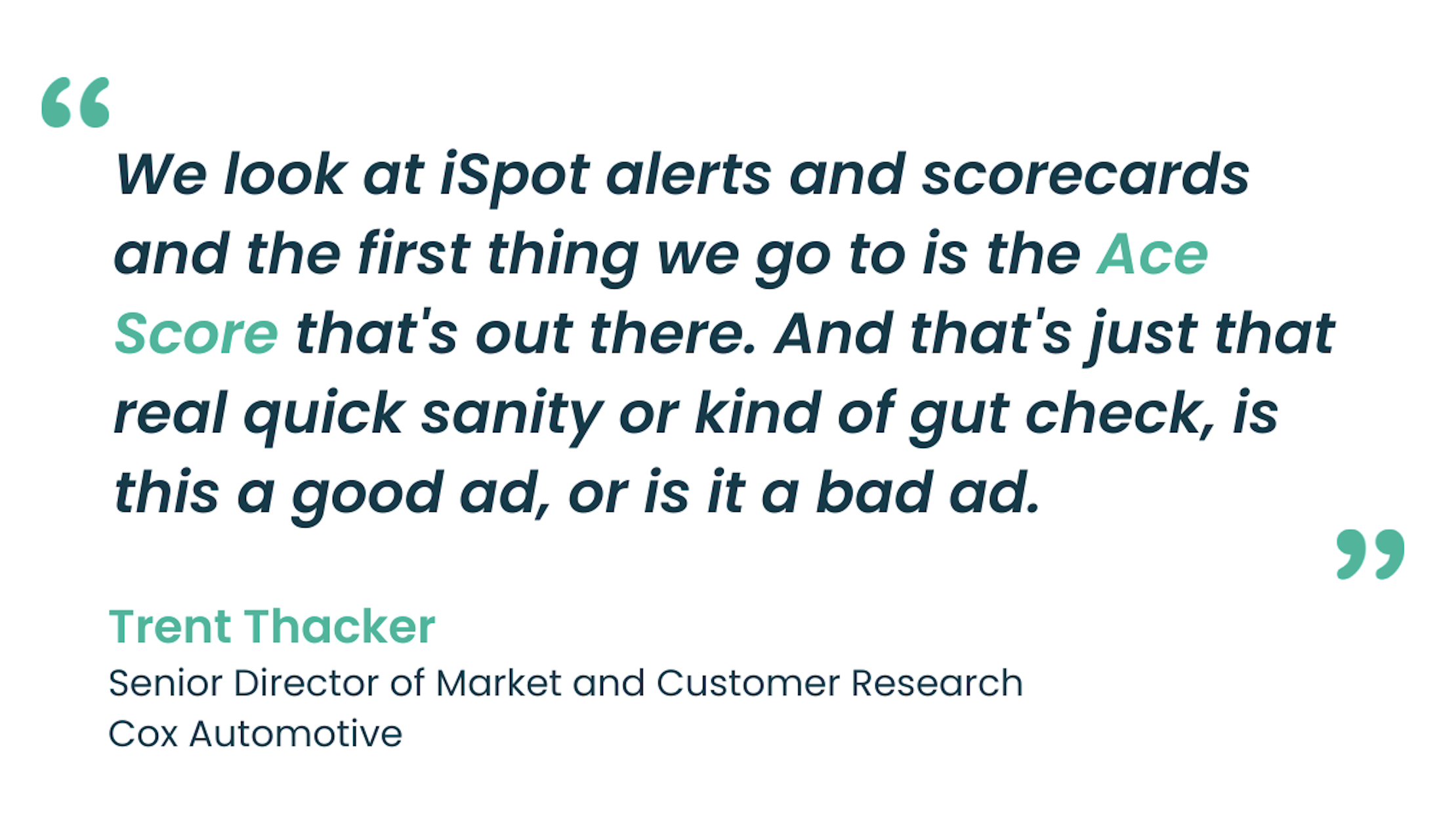 When Cox Automotive tests creative through iSpot, they focus on performance-driving metrics that extend beyond the initial Ace Score*, serving as a gut-check for the brand. A key focus is the Information Score*, which is paramount because vehicle shoppers typically spend 90 to 100 days in-market doing extensive research. Since they serve a broad audience, from first-time Gen Z buyers to Baby Boomers, the ability to clearly and successfully convey information is essential. Trent notes that a high Information Score positively impacts the overall Ace Score, confirming that consumers value the educational aspect.