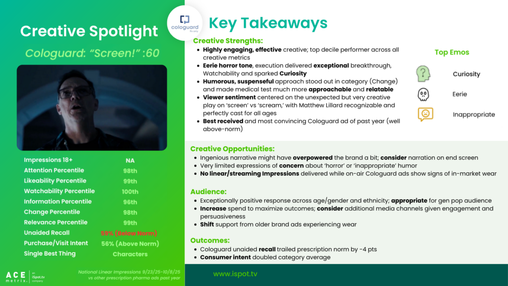 • “Screen!” absolutely trounced all other Cologuard ads at driving consumer intent, suggesting serious consideration be given to increased budget and/or media beyond social to take advantage of the spooky season and this level of persuasion (perhaps with a few quick edits to enhance branding such as narration on the end screen).