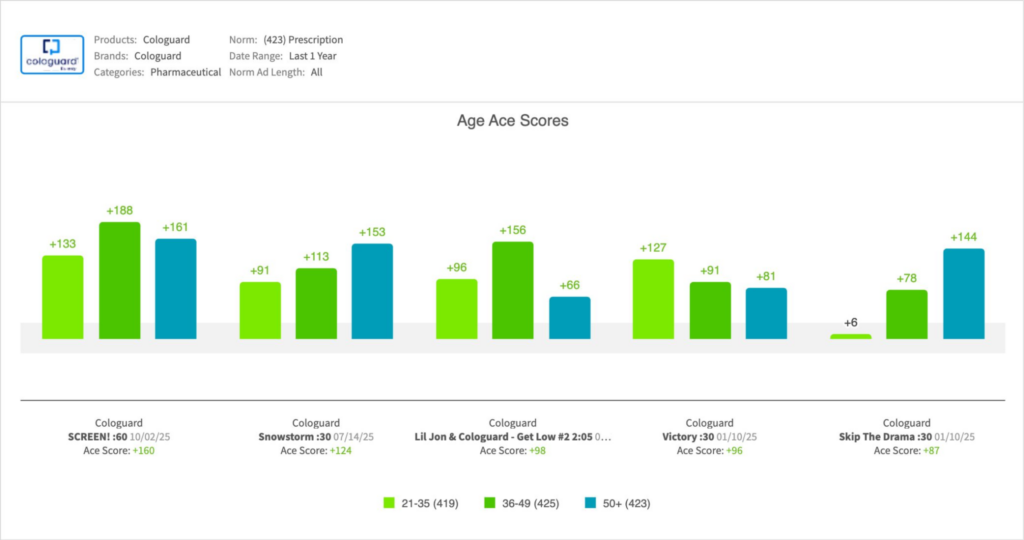 • While Cologuard ads over the past year have been quite effective in resonating across age, “Screen!” topped the list across every age group: