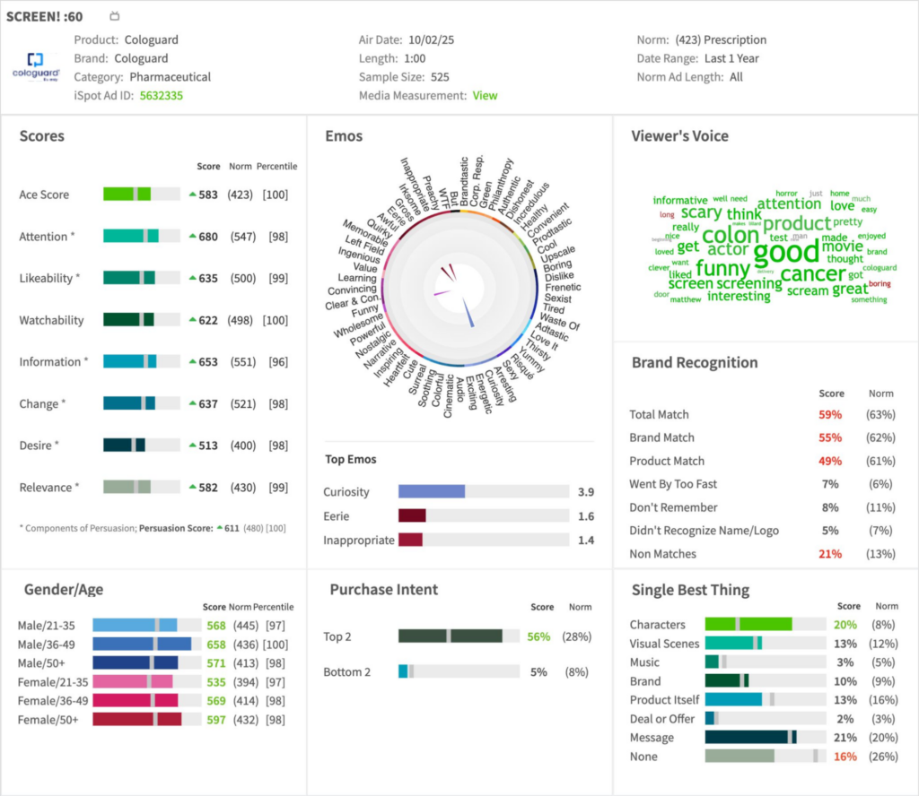 • The ad’s opportunity lay in branding as only 59% successfully recalled Cologuard on an unaided basis (vs a 63% norm).  Non-matches were provided by 21% of all viewers, far exceeding the 13% norm with most misattributions mentions of some form of the generic ‘screen.’