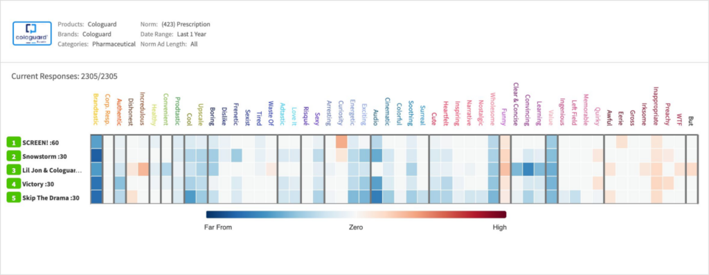 • Emotional profiling reveals how effective “Screen!” was at sparking Curiosity vs other Cologuard ads, all of which employed some level of humor (landing as lightly Inappropriate to some viewers):