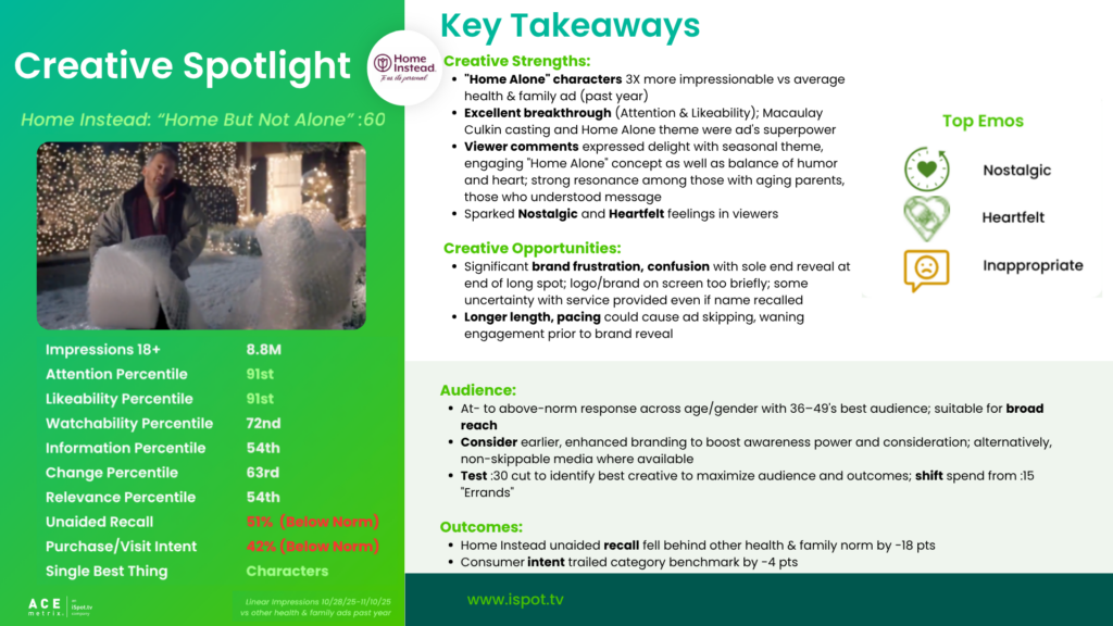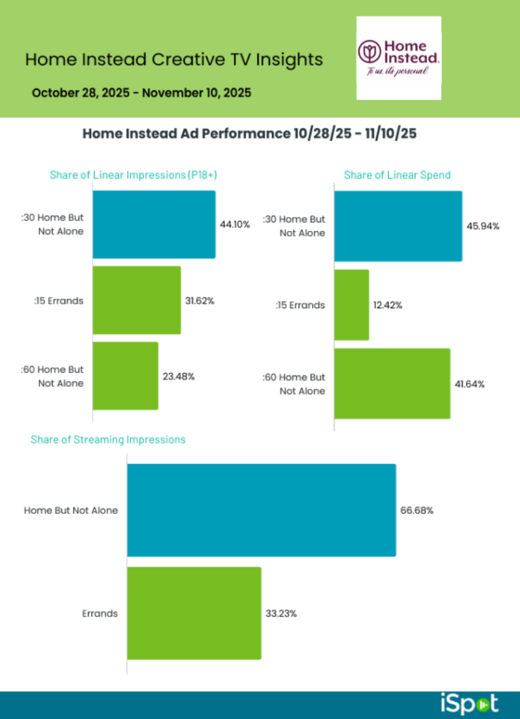 - iSpot Media Measurement reports a strong favoring of the :30 “Home But Not Alone” in national linear Impression delivery since launch (through 11/10/25):