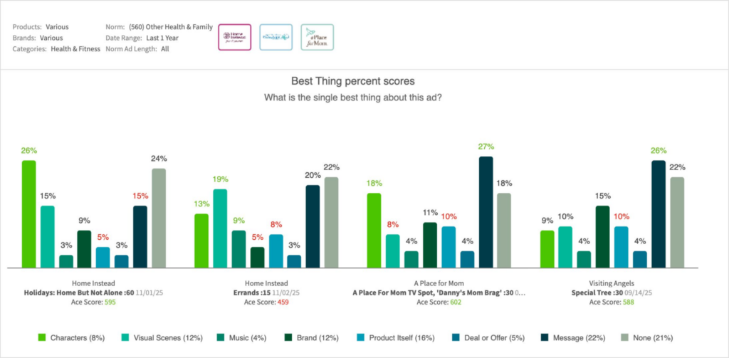 - However, the :60 was highly competitive with A Place for Mom “Danny’s Mom Brag” and Visiting Angels “Special Tree,” all of which employed message and/or character-driven narratives.