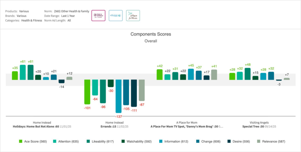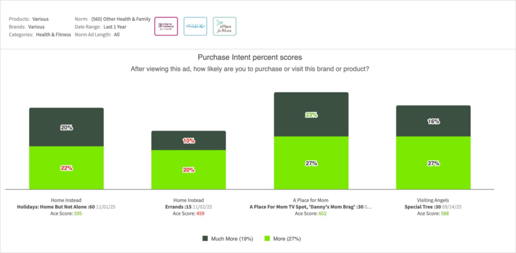 - “A Place for Mom” was the clear leader in persuasion, converting its creative success into above-norm consideration (50%), while “Visiting Angels” (43%) performed at norm and “Errands” trailed significantly. As such, the opportunity to remove budget from the :15 could be considered.