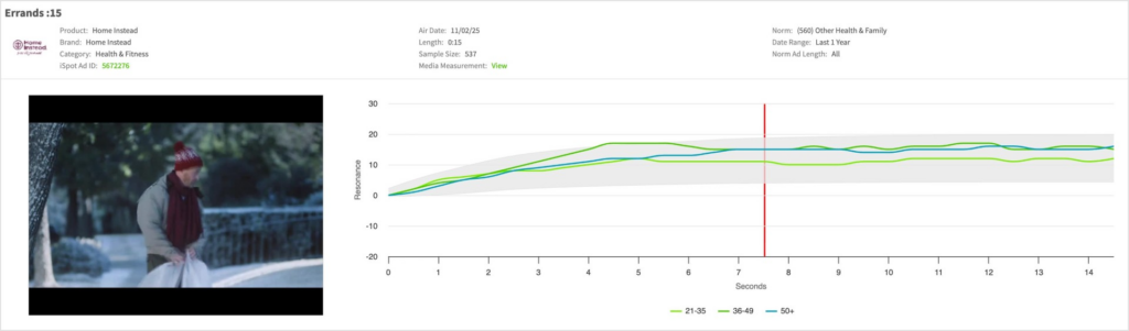 - Second-by-second trace results show a loss of engagement among viewers 21-35 for both the hero :60 and the :15 “Errands,” likely as a result of the unidentified brand throughout the ads: