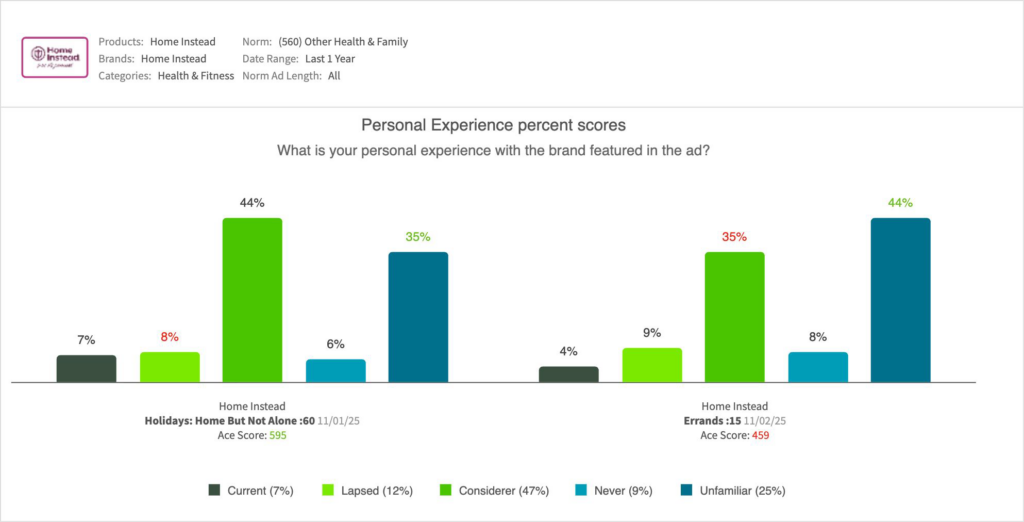 - While positive, the ad’s overall perception of Information and Relevance was at norm, which likely tempered consideration to some degree. While this could be acceptable given that every viewer may not have the need for Home Instead at the time of viewing, brand recall (unaided) was not firmly cemented. As such, awareness of the brand was at least a partial lost opportunity.