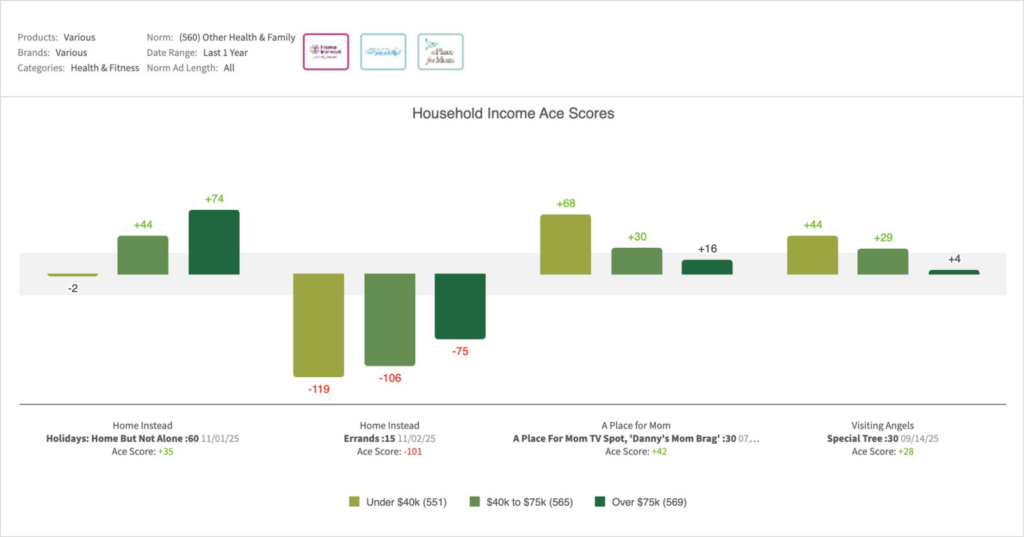 - The hero “Home But Not Alone” saw an opposite income skew vs competitive ads reviewed, resonating most successfully with viewers earning $75K or above in annual income: