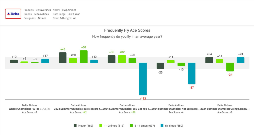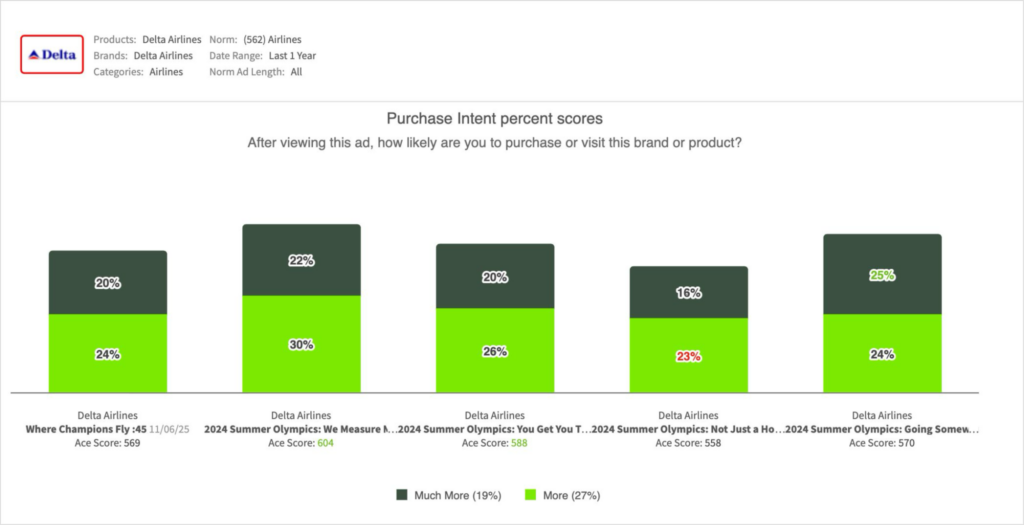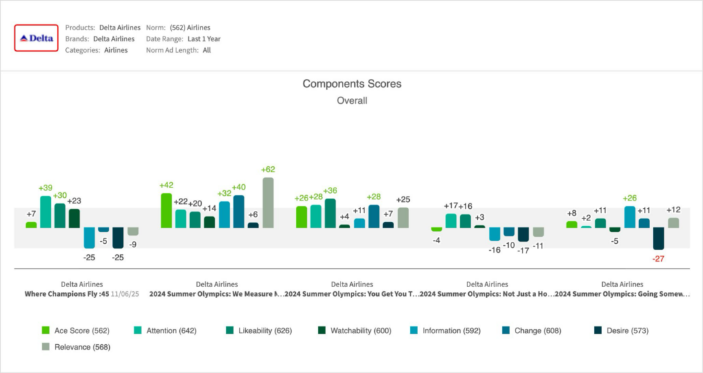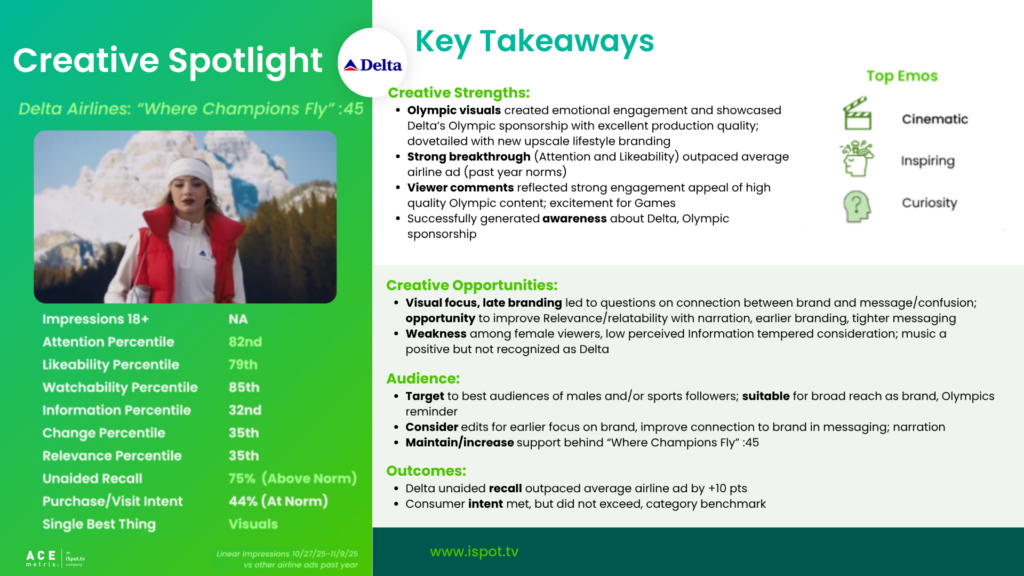 - When compared to four ads from the Summer Olympics campaign, “Where Champions Fly” was a mid-to-low-tier performer, highlighting the higher funnel/strategic application at this stage with the Games still months ahead (with a February 6, 2026 start):