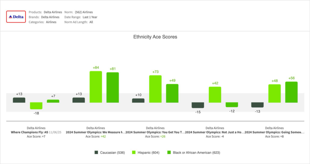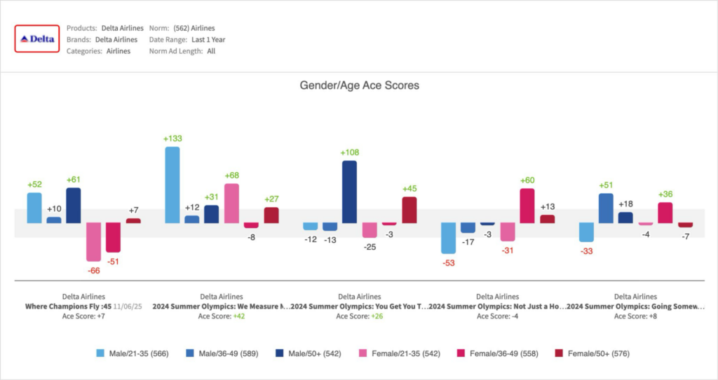 - Across age/gender, earlier Delta Olympics ads also showed varying levels of connection but “We Measure” was once again the most broadly appealing of the group: