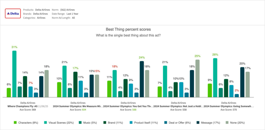 - Single Best Thing ratings confirm the particularly strong visual focus of “Where Champions Fly” vs Summer Olympics Delta ads, which tended to have a bit more balance between message and/or brand and visuals: