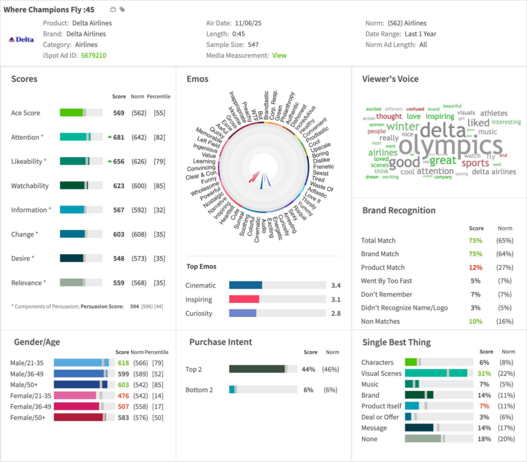 - While the ad succeeded as an Inspiring, top-of-funnel brand piece, it was less powerful in persuasion, as perceived Information or a compelling reason to purchase came in at normative levels.