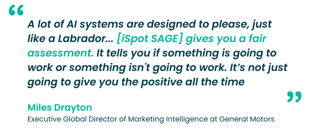 For a global powerhouse like GM, “good vibes” don’t sell cars. Miles emphasized that iSpot SAGE is different because its agentic AI is grounded in 16 years of proprietary data, not generic, unverified internet information. It provides a fair—sometimes tough—assessment of creative. This intelligence allows GM to identify the friction points in a campaign before they bet their entire budget on it.