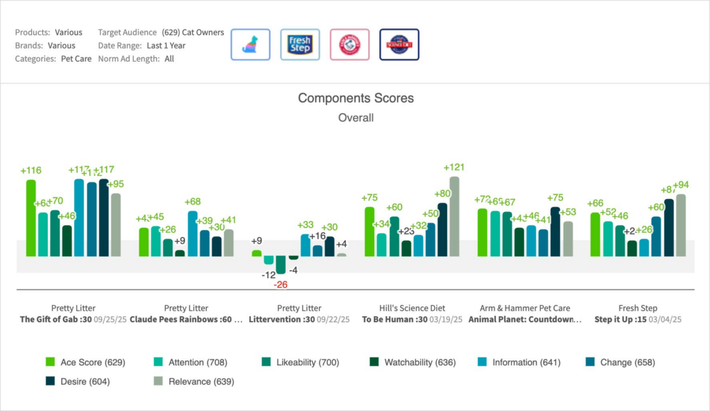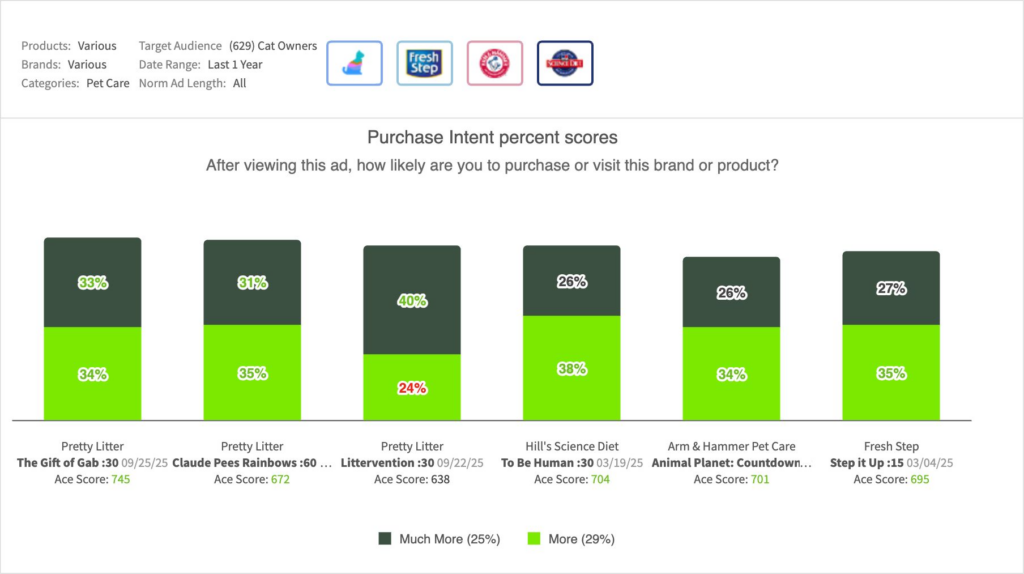 - Competitive ads saw somewhat lower intent rates with Arm & Hammer’s spot highlighting Hard Ball Litter while Fresh Step promised 30-day odor control.