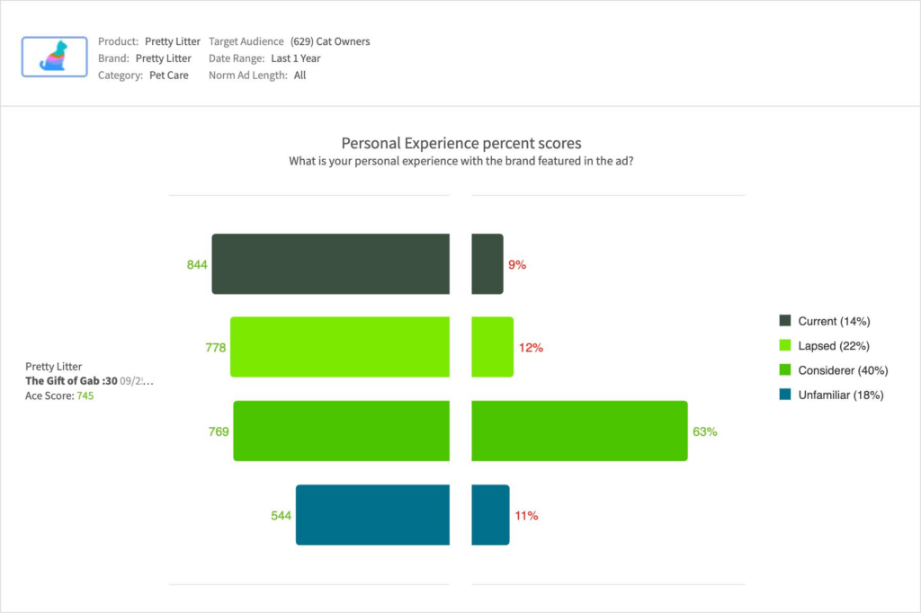 - PrettyLitter’s :30 “Gift of Gab” stood apart among recent pet care ads specifically featuring cat care, in overall response among cat owners (ranking first among pet care ads of the past year within this audience), with cat owners finding the spot particularly informative, Relevant, and effective in driving Desire: