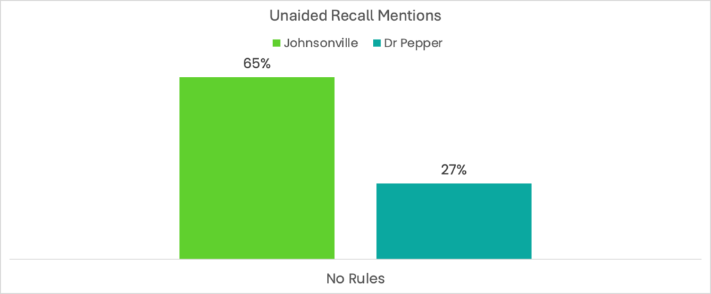 • The creative reminded viewers of at least one of the tie-in brands, with 65% recalling Johnsonville and 27% responding with Dr. Pepper (unaided) indicating clear concept communication.
