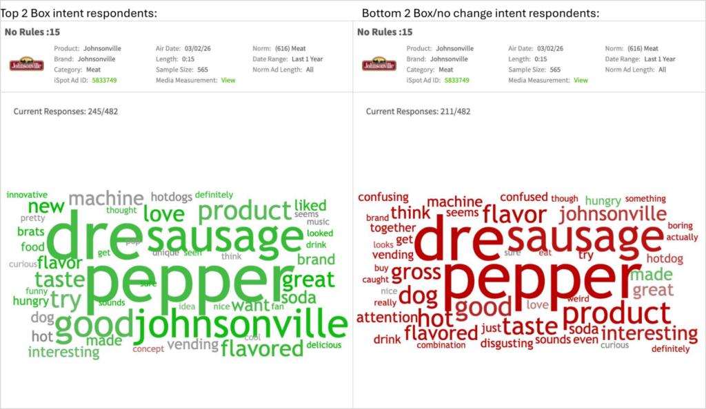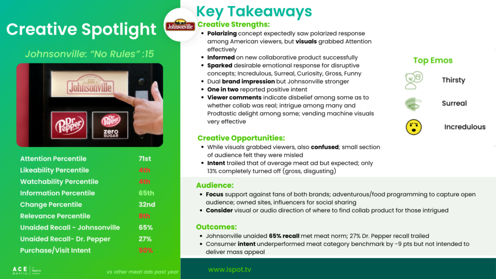• As expected, response to the unexpected sausage and soda collaboration across the full gen pop audience averaged into a below-norm creative response vs the one-year meat norm. A collab designed to divide opinion will structurally deflate aggregate scores — the bottom portion of the audience was never going to buy Dr Pepper sausage regardless of creative quality; however, the :15 “No Rules” achieved four key objectives: