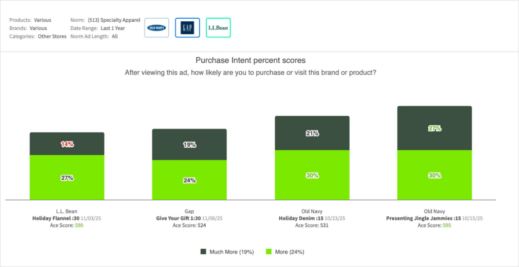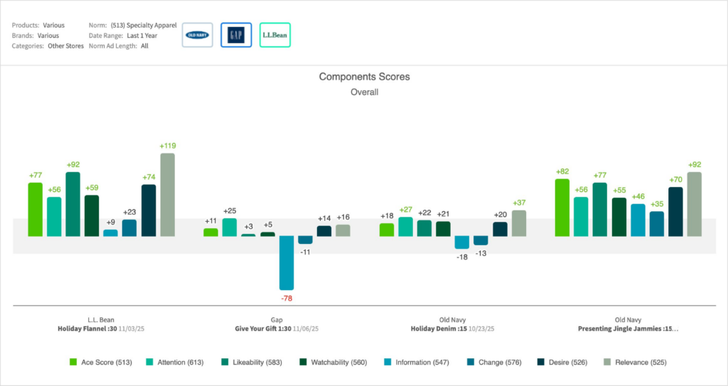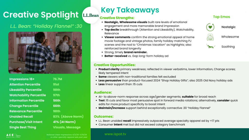 - L.L. Bean :30 “Holiday Flannel” enjoyed much stronger resonance vs Gap’s long-form holiday (choir) ad this year, but Old Navy’s “Jingle Jammies” were a resounding hit with American viewers: