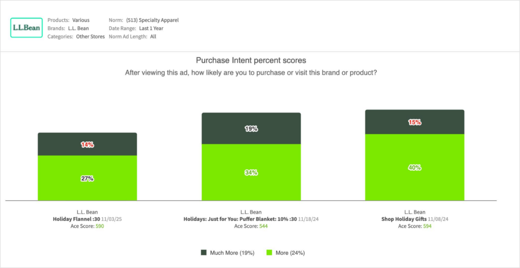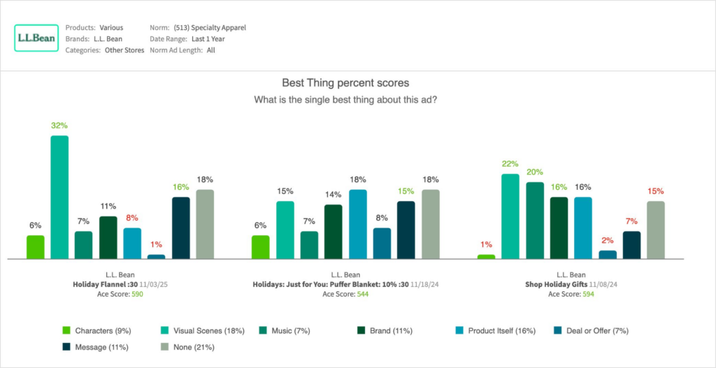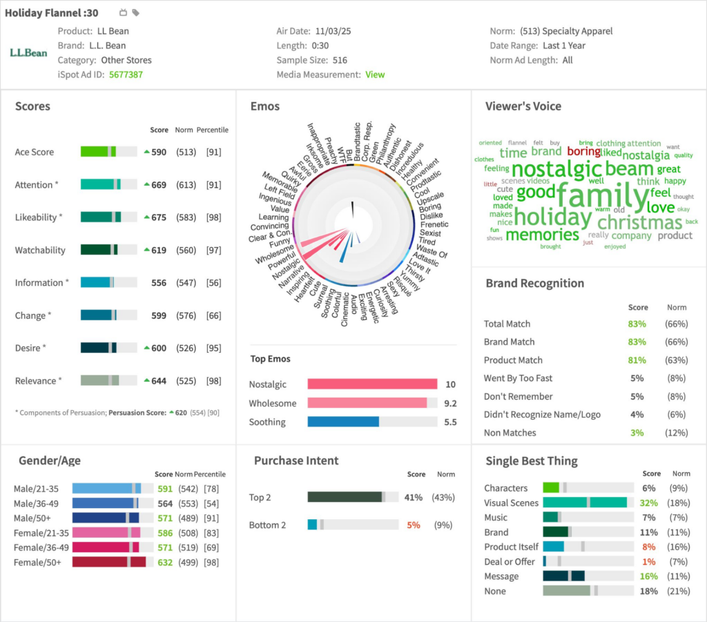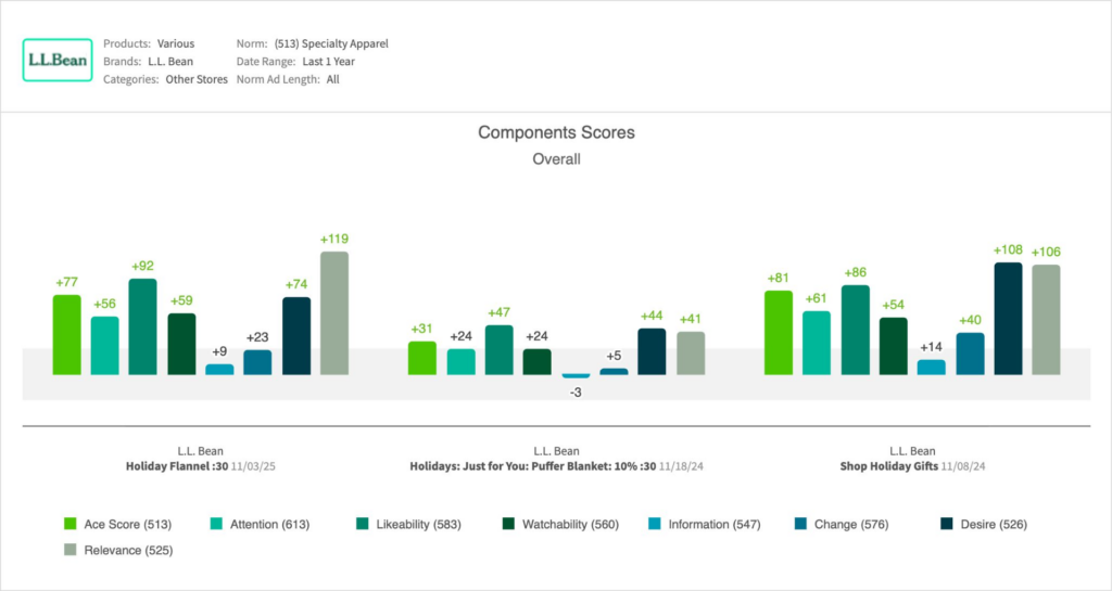 - Earning well-above-norm breakthrough, viewers also clearly caught the branding as L.L. Bean unaided recall outpaced benchmark by an impressive +17 pts. This proves the ad’s success as a timely brand reminder.