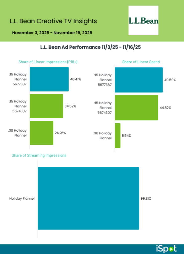 - iSpot Media Measurement reports a favoring of two :15 cuts on linear over the two weeks ending 11/16/25: