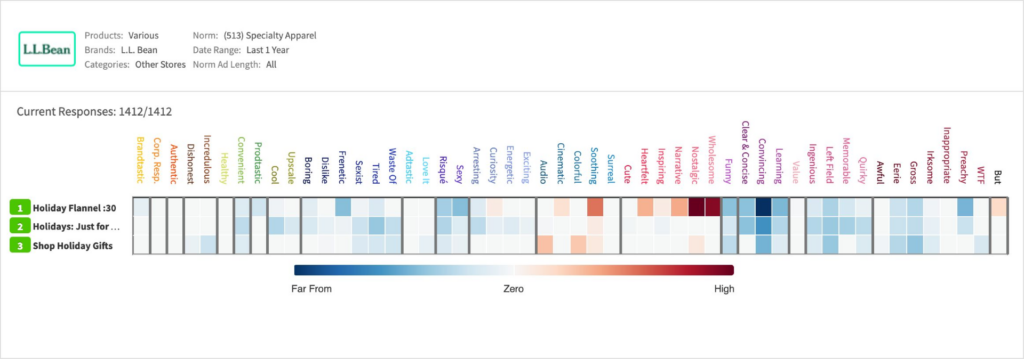 - The :30 “Holiday Flannel” was highly effective at creating a positive emotional connection, achieving a Likeability score well-above the one-year specialty apparel norm (98th percentile), driven by rare levels of Nostalgic and Wholesome emotion – perfect for the season: