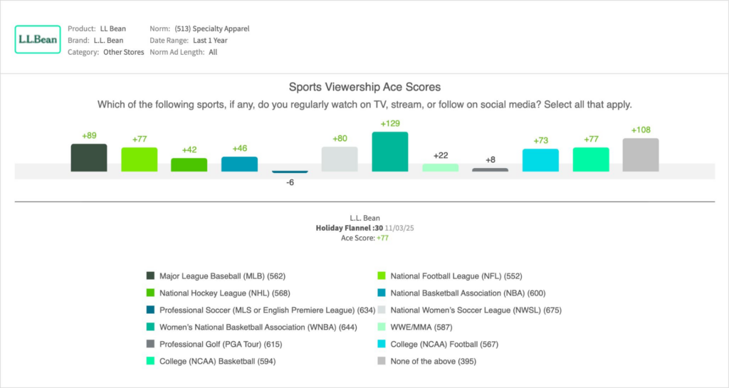 - The overall appeal of the”Holiday Flannel” :30 was evidenced across viewers of most pro and college sports, allowing L.L. Bean flexibility in media placement so as to optimize reach within budget: