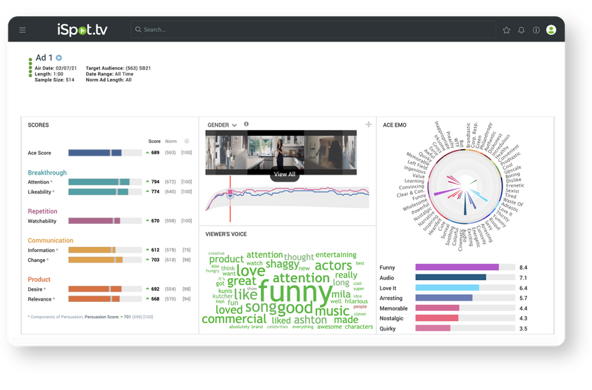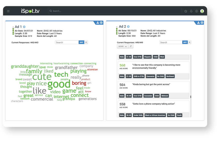 Determine the reasons behind the creative assessment scores through hundreds of unfiltered voice-of-the-consumer responses for each ad. Voluntary, open-ended comments provide a unique view into the creative elements that mentally and emotionally break through with viewers. Demographic traits and scores are available for each verbatim comment — linking the qualitative and quantitative response.