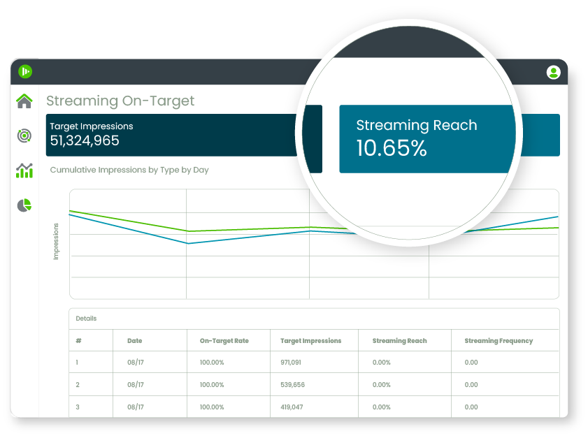 Streaming Verification is the ultimate solution for streaming advertisers looking to fine-tune ad delivery. Get a holistic view of streaming advertising, bringing a broad range of performance metrics into a single dashboard to understand unique streaming audience reach, on-target delivery, and verified ad delivery.